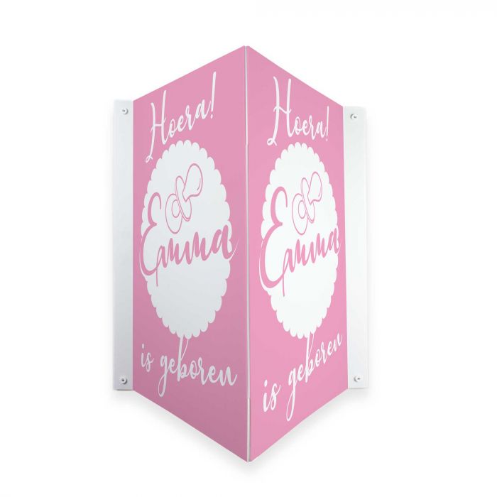 Een gepersonaliseerd geboortebord voor aan de buitenkant op het raam. Ook wel bekend als makelaarsbord.